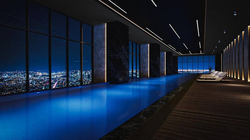 | 施設 | ロイヤルフロア50階、レストラン77階、スカイプール77階、インナープール49階、ウォーターパーク49階、競泳用プール27階、スカイバー77階、サウナ49階、大浴場49階、スパ49階、フィットネスジム27階、キッズプレイスペース11階、プールバー(ビリヤードルーム)11階、卓球場11階、ボウリング2レーン(11階)、カラオケボックス×4R(11階)、カフェ&ラウンジ50階、ワインクーラー(50階)、ミニショップ(50階)、ビジネスルーム(50階)、オアシス(公園)26階、展望台78階、ランドリーサービス(49階)、ゴミステーション(全フロア) 11階ナースステーション、地下1階~10階駐車場 |